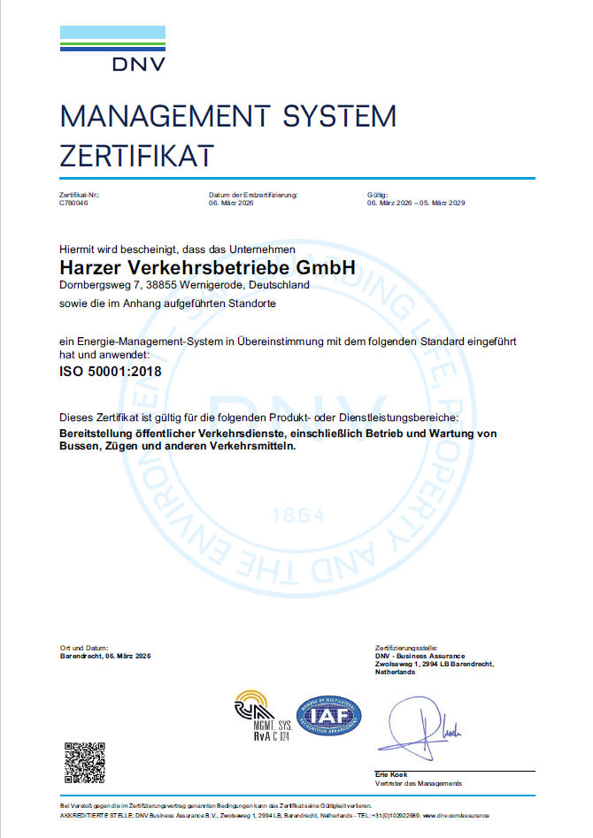 Die Harzer Verkehrsbetriebe setzen einen weiteren wichtigen Schritt in Richtung Nachhaltigkeit und Energieeffizienz: Unser Unternehmen wurde erfolgreich nach der DIN EN ISO 50001 zertifiziert. Damit bestätigen unabhängige Auditoren, dass unser Energiemanagementsystem den hohen Anforderungen dieser internationalen Norm entspricht und wir unseren Energieverbrauch systematisch analysieren, steuern und kontinuierlich verbessern.